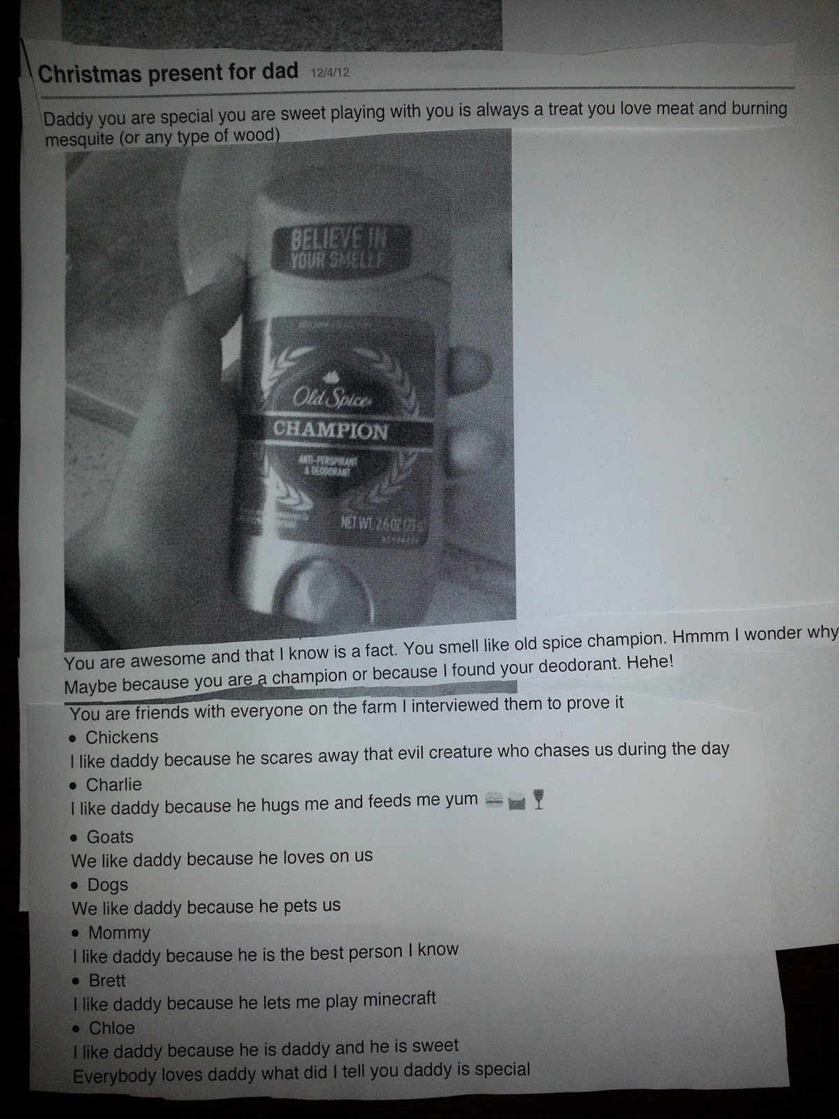 Today I also happened upon a Christmas gift to her daddy from Chloe. It reads: "Daddy you are special you are sweet playing with you is always a treat you love meat and burning mesquite(or any type of wood).